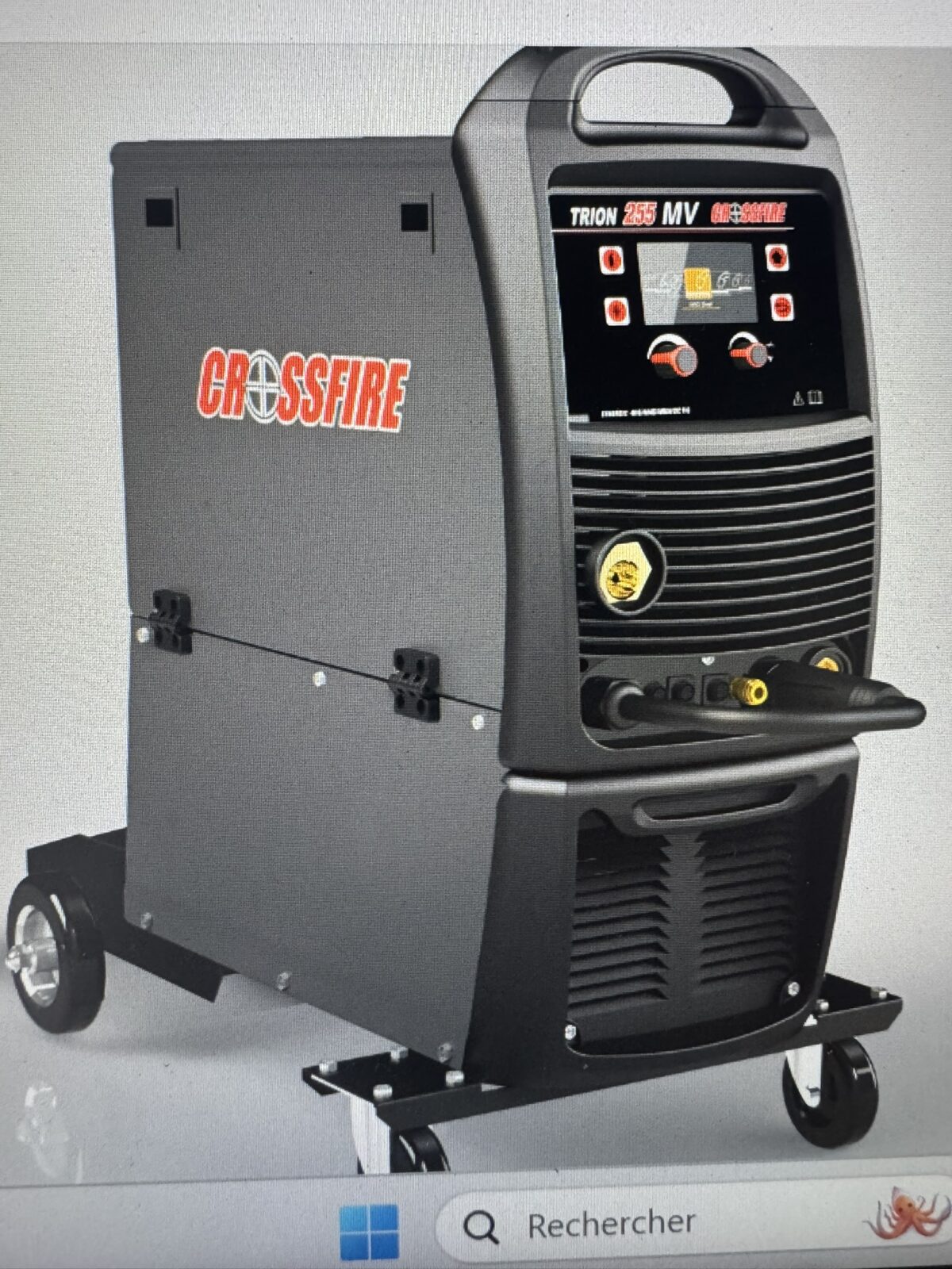 Soudeuse multi proceder Crossfire de 250 ampere qui fonctionne sur le 220 et le 600 volts. Model Trion 255MV. Soude au mig- tig et arc. Garantie de 3 ans. Vendu complète avec tout les câbles et la pedal pour le tig.